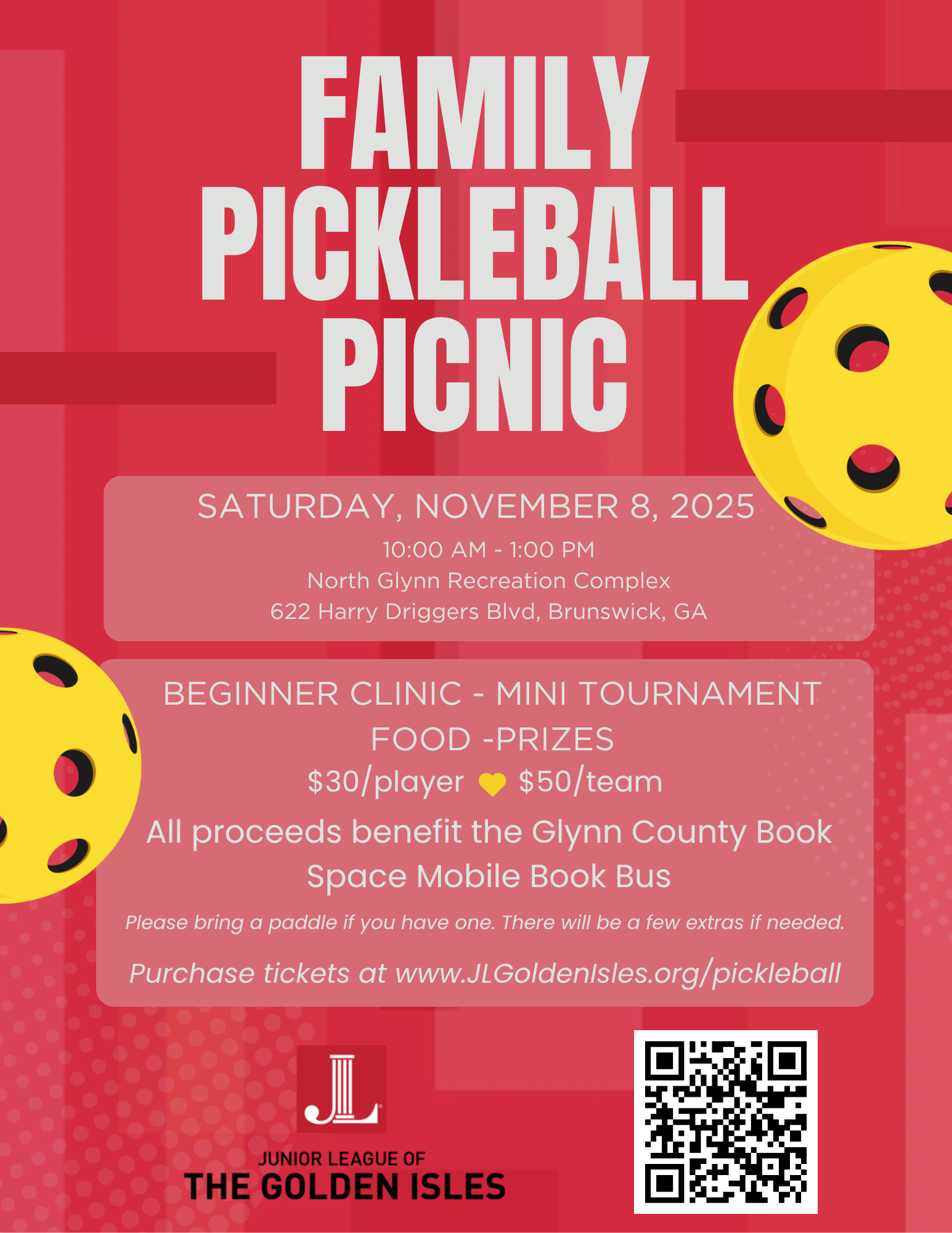 Bring the whole family (and a paddle if you have one) to learn how to play pickleball and enjoy some friendly competition. There will be prizes, food, kid activities and more. All the money raised benefits the Book Space — a mobile book bus bringing stories to kids across the Golden Isles!